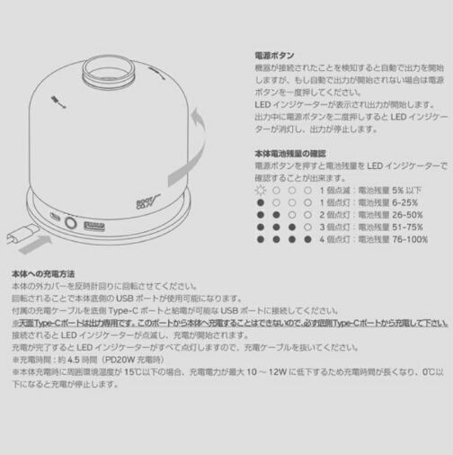 ・気温が10℃以下の環境ではバッテリーの出力が少なくなり、側面のType-C端子の出力が停止します。また、0℃以下になるとバッテリーの保護回路のため充電ができなくなります。