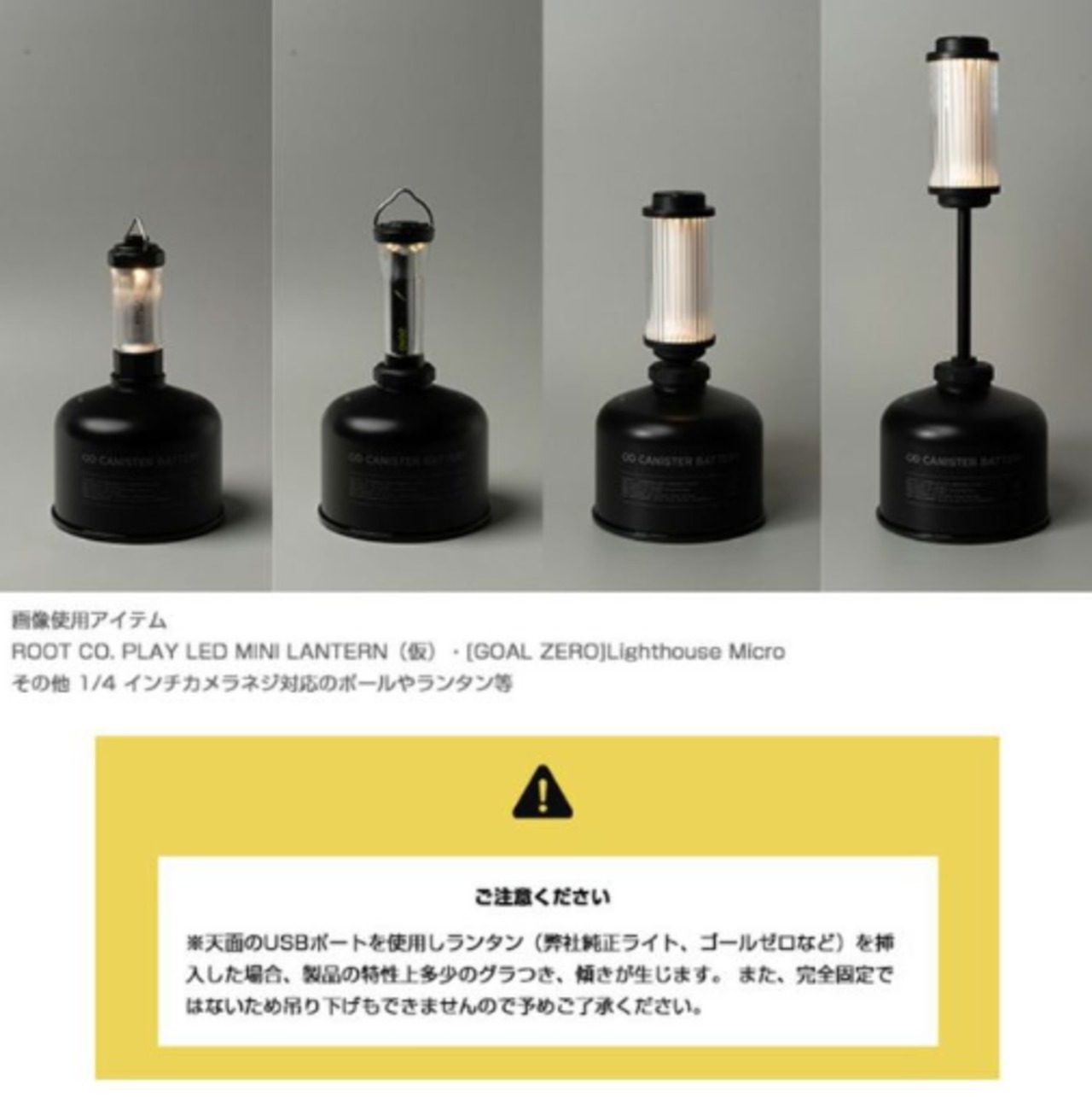 ※3 天面のUSBポートに他社製ランタン(弊社純正ライト、ゴールゼロなど)を挿入した場合、製品の特性上多少のグラつき、傾きが生じます。また、完全固定ではないため吊り下げてもきませんので予めご了承ください。