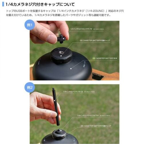 トップのUSBポートを保護するキャップは「1/4インチカメラネジ(1/4-20UNC)」対応のネジ穴を備え付けているため、1/4カメラを搭載したパーツやガジェット等も連結可能です。