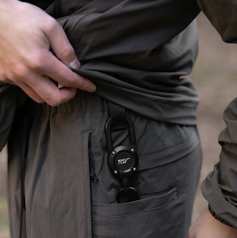 ギアの吊り下げが可能なカラビナループは、フロント右左側のゴム紐ループ・ウエスト両サイドのウェビングループの全3箇所。ROOT CO.のMAG REELシリーズや各種カラビナとの相性も抜群です。