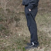 コーディネートしやすいテーパードシルエット。ウエストゴムに加え、ジッパーフライ仕様にナイロンベルトも搭載しました。